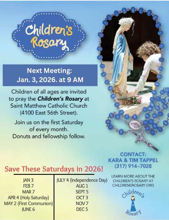 Parents and kids of all ages are invited to join us for the Children’s Rosary. Meetings are held in the Chapel on the first Saturday of every month at 9:00 a.m. Donuts and fellowship follow the Rosary. Please direct any questions to Kara and Tim Tappel at (317) 914-7028.