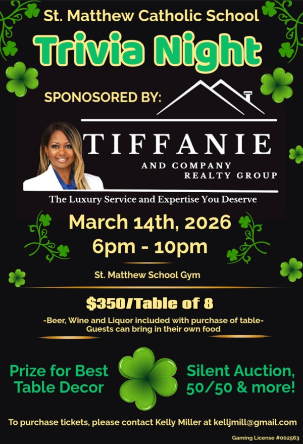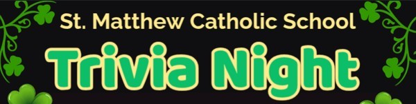 St. Matthew Catholic School will have its annual Trivia Night on March 14th from 6 PM to 10 PM. Attendance and support of this event helps raise funds for our terrific school. Please help us continue to make our students and school thrive.