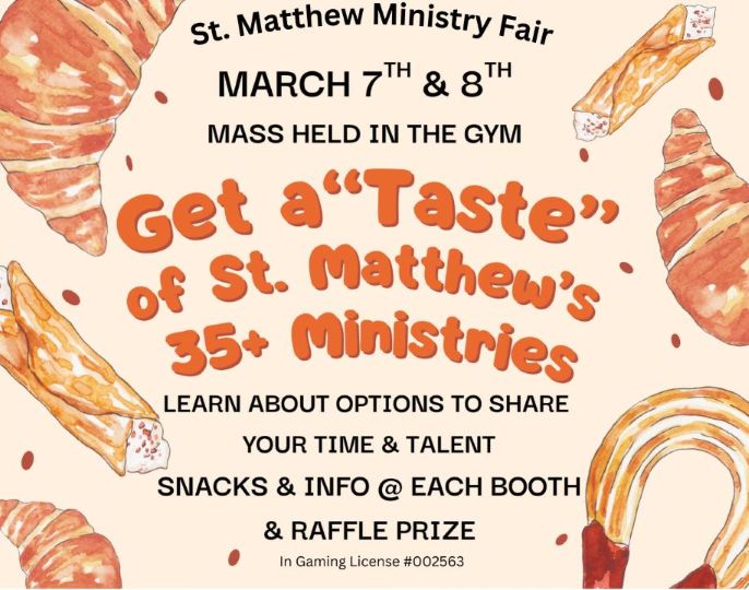 Our St. Matthew Parish Ministry Fair will be held along with all weekend Masses on March 7-8. We need help setting up and tearing down this important event to help promote ways for our community to become involved and give back to our parish. On Sat., March 7, we will be setting up the gym (stage, tables, and chairs) from 8 a.m-10 a.m., and on Sunday, March 8, we will be tearing down everything beginning shortly after the 11:30 am Mass.